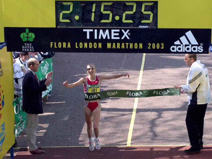 The 2003 London Marathon was Radcliffe’s masterpiece. She smashed her own record by almost 2 minutes with her now legendary 2.15.25. Radcliffe ran incredibly fast from the start, covering one of the early miles in 4.57! She backed off a little, and passed through halfway in 68.02. The second half was run in a phenomenal 67.23 and putting that into perspective, her time for the second half of the race would still win many major half marathons around the world and is faster than Kerryn McCann’s Australian record (67.48).