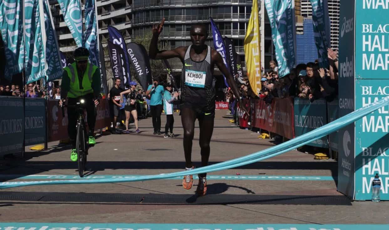 Elijah Kemboi of Kenya won his first Blackmores Sydney Marathon with a time of 02:13:37 He and Ugandan runner Thomas Ayeko stuck together for 40km of the 42km course until Kemboi made a break for it 2km from the Sydney Opera House finish line. Ayeko crossed the line just two minutes and 14 seconds behind Kemboi with a finish time of 02:15:52, followed by Birhanu Addisie of Ethiopia in third place (02:16:25).