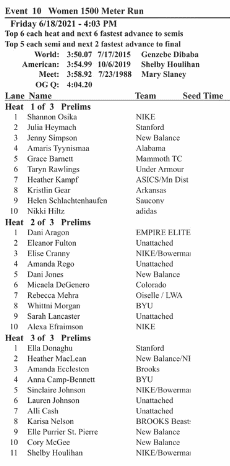 In an incredibly weird turn of events, Shelby Houlihan, whose name was removed from the USATF Olympic Trials 1500m start list after she was banned for four years, has found her name return to the list of starters, as of 1am Eugene time on Friday 18th June. The 1500m heats are set for 4:03pm, today.
