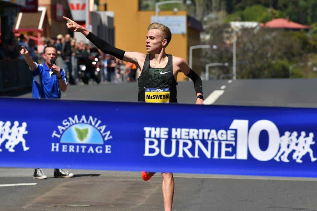The “Mayor of King Island”, Stewart McSweyn has defended his Heritage Burnie Ten title and this time by smashing the race record with 28:03. The course record was previously held by Darren Wilson 28.11, which was set in 1997. Coached by Nic Bideau, McSweyn who has gone from strength to strength this year, absolutely dominated the field from the gun, producing the biggest winning margin in race history. His run was also the fastest by an Australian ever on home soil and now ranks him as the 4th fastest Australian All-Time. Last week’s Melbourne Marathon winner, Liam Adams, finished second 1 minute and 41 seconds behind the Tasmanian with 29:44. Considering Adams ran a sub 2:16 marathon only 7 days ago, his performance here was highly commendable to say the least. Andy Buchanan rounded out the top 3 with a 30:05.