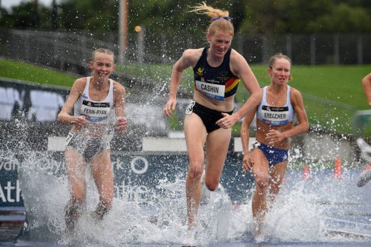 The two championship steeples were a contrast. In the women’s race, a group of five broke away virtually from the gun. At the bell, Cashin, Brielle Erbacher and Cara Feain-Ryan remained locked together as Tokyo Olympian Georgia Winkcup and Stella Radford fell back. All through the race, Cashin had gained ground at the four ‘conventional’ hurdles but lost it to Erbacher at the water jump.