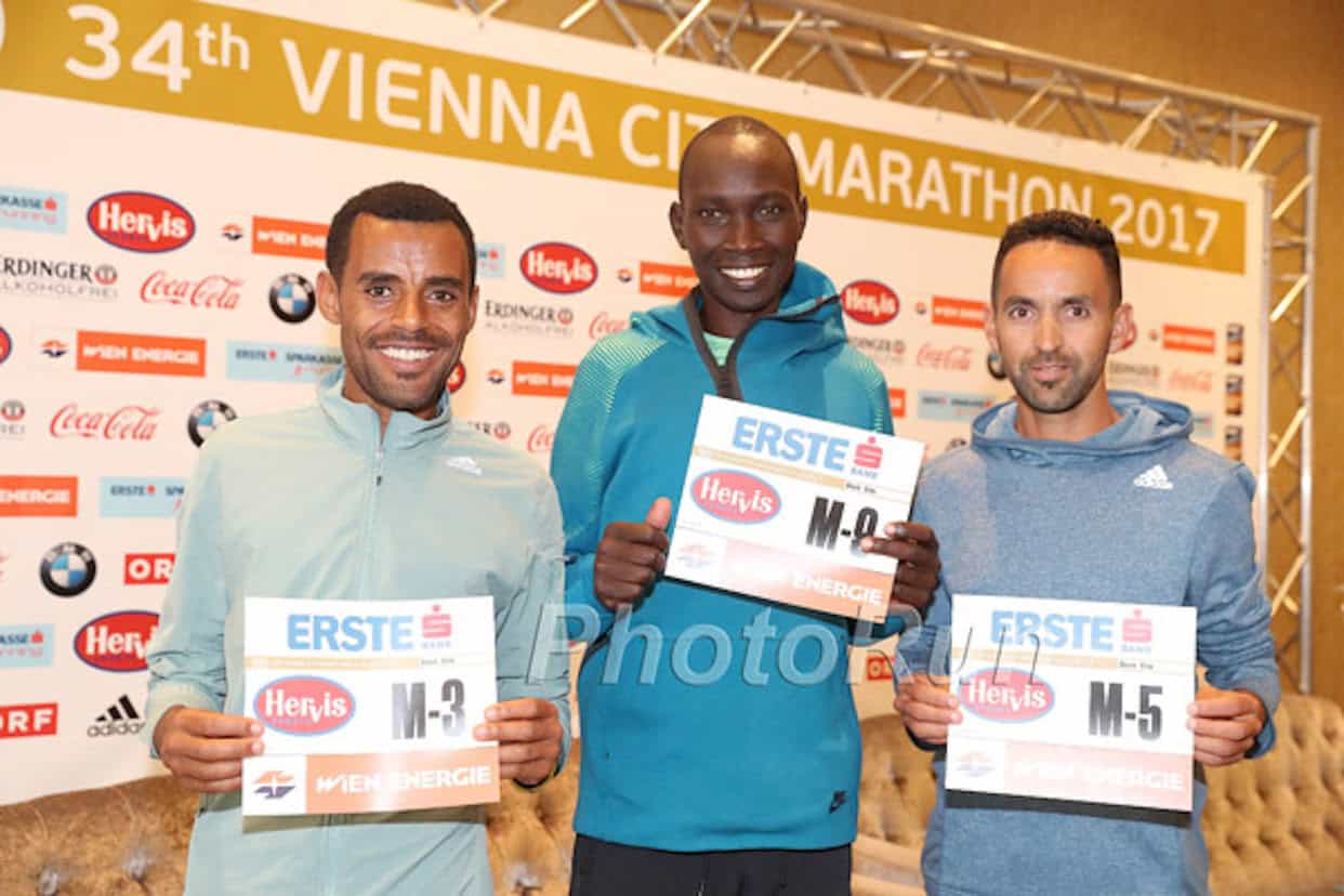 Ten runners feature personal bests of sub 2:10 in what is likely the best ever men’s elite field in the history of the Vienna City Marathon. Depending on weather conditions organisers hope for a winning time of 2:06or may be a bit faster with the current course record standing at 2:05:41. „If the weather is fine I want to run 2:05 or 2:06 on Sunday,“ said Deribe Robi during today’s press conference in Vienna. With a personal best of 2:05:58 the Ethiopian is the second fastest runner on the start list behind Kenya’s Eliud Kiptanui (2:05:21).