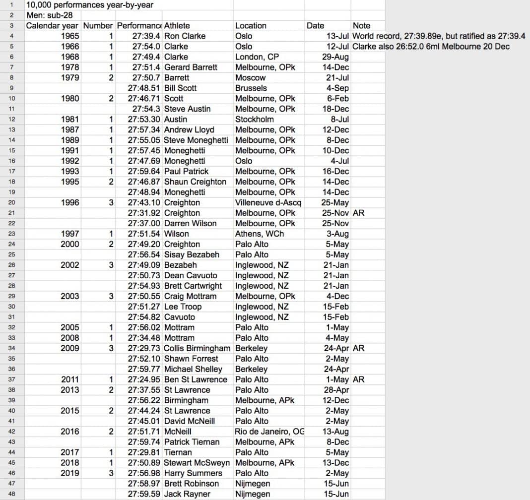 The IAAF records and lists page lets you filter all-time lists down by country, so it was relatively easy to draw up a list of sub-28 performers and performances. First thing I discovered was that it has holes – strangely missing from the list are Shaun Creighton’s 27:31.92 and Darren Wilson’s 27:37.00 in the Zatopek in which Creighton finally broke Clarke’s national record.